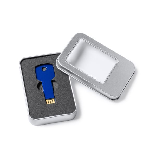 Memoria USB 2.0 de aluminio con diseño extraplano en forma de llave. Dispone de una capacidad de 16 GB.