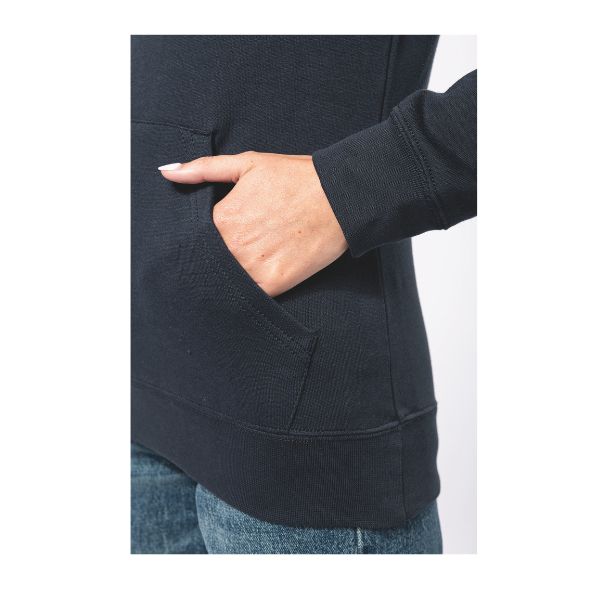 Pasacables para auriculares en el bolsillo tipo canguro y el cuello.